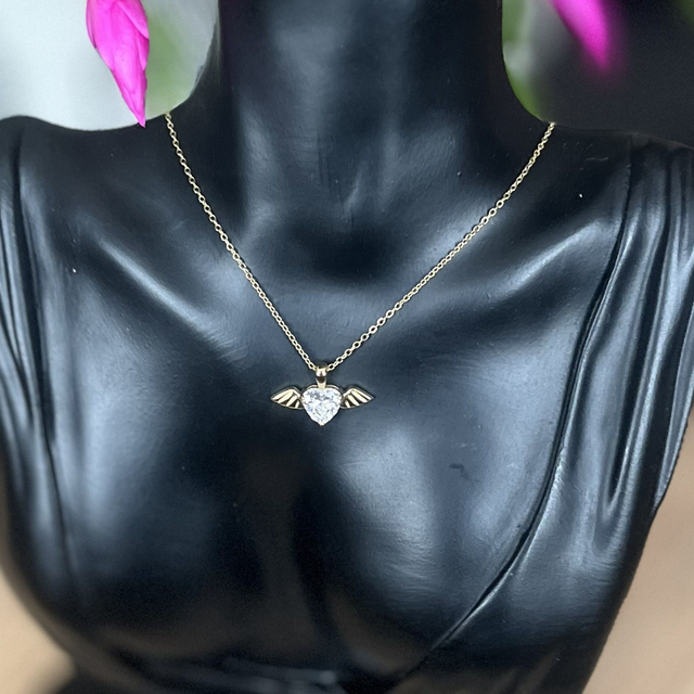 Le cœur, magnifiquement formé par une pierre blanche éclatante, symbolise l'amour et la protection, tandis que les ailes ajoutent une touche d'élégance et de légèreté à ce bijou unique.