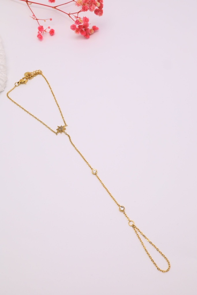 Son design épuré relie harmonieusement le doigt au poignet par une chaîne fine, ponctuée de pierres lumineuses qui apportent une touche d’éclat subtile.