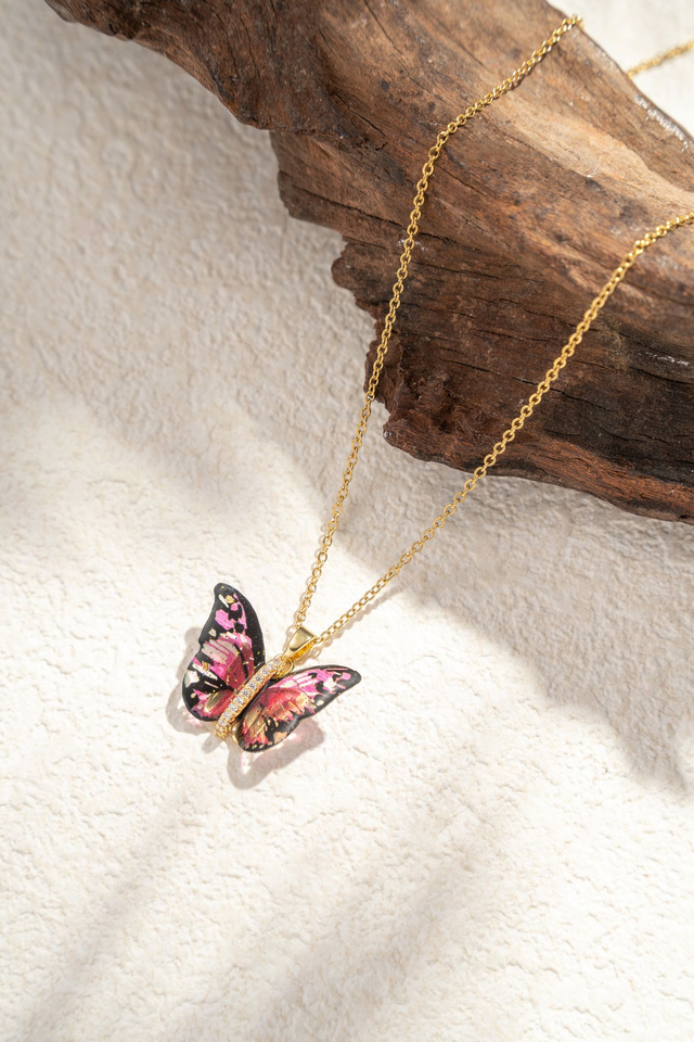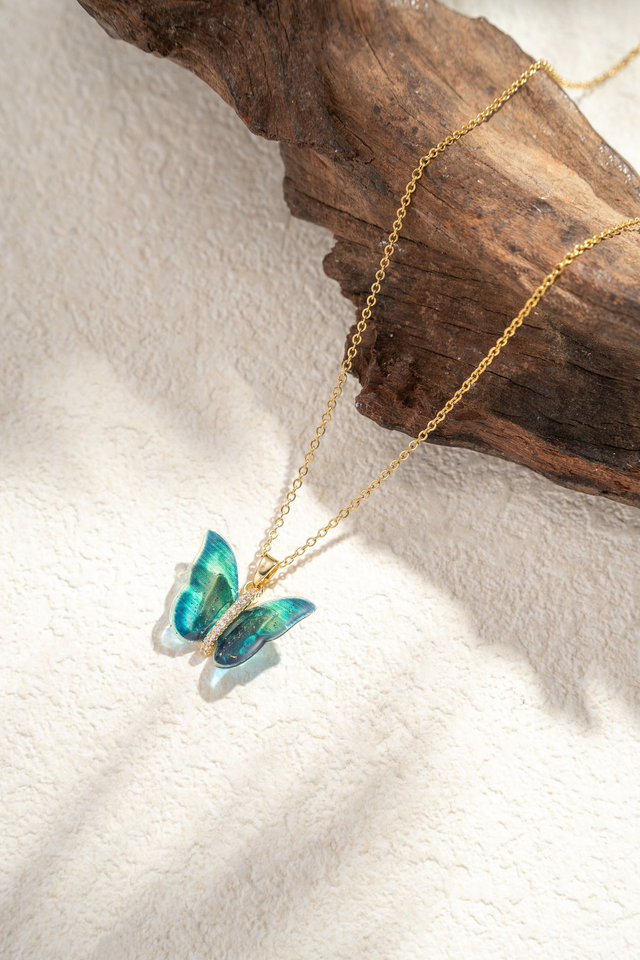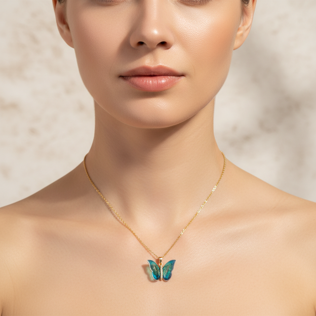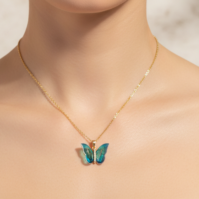Son pendentif papillon se distingue par ses ailes translucides aux nuances pastel, disponibles en bleu doux ou rose tendre, qui captent subtilement la lumière pour un rendu aérien et raffiné.