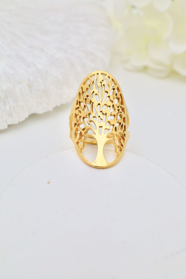 Bague ajustable motif arbre de vie en acier inoxydable doré