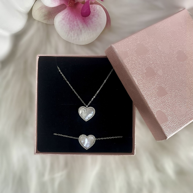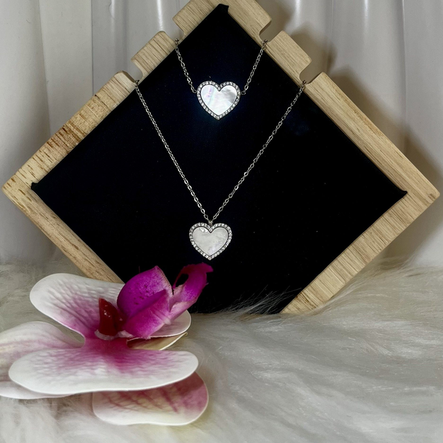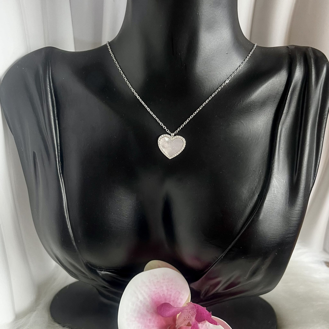 Son pendentif en forme de cœur, orné d’une nacre irisée et délicatement entouré de zircons scintillants, capte la lumière avec subtilité pour illuminer votre décolleté.