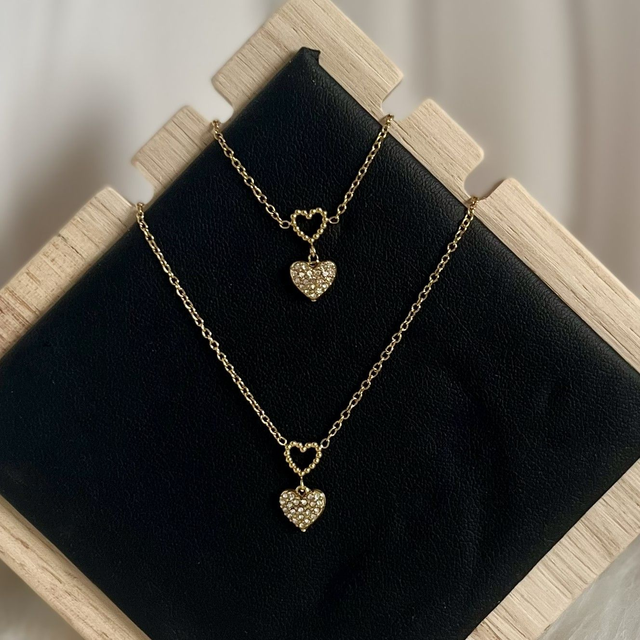 Sur ce cœur, un second cœur suspendu, délicatement orné de strass blancs éclatants, ajoute une note de brillance et de raffinement.
