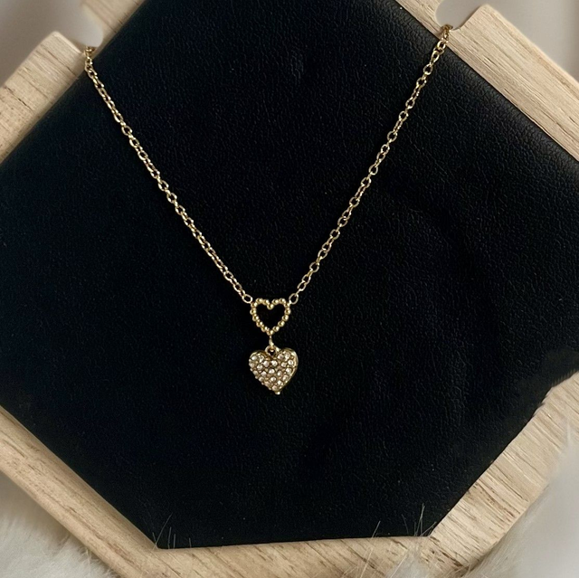 Le pendentif principal est accompagné d’un second cœur suspendu, orné de strass blancs étincelants qui ajoutent une touche de brillance et de glamour.