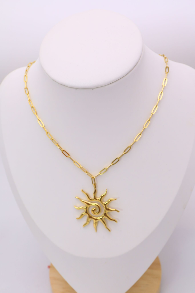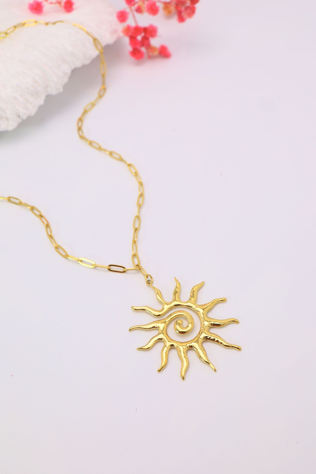 Élégance et Symbolisme Apportez une touche de lumière à votre style avec ce magnifique collier soleil en acier inoxydable doré.