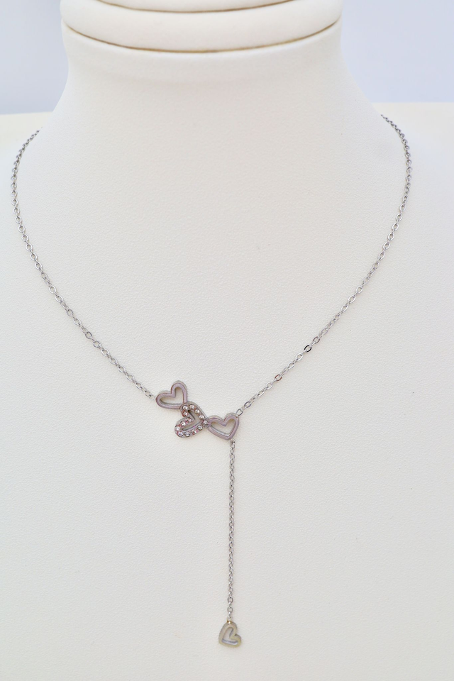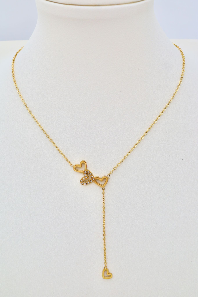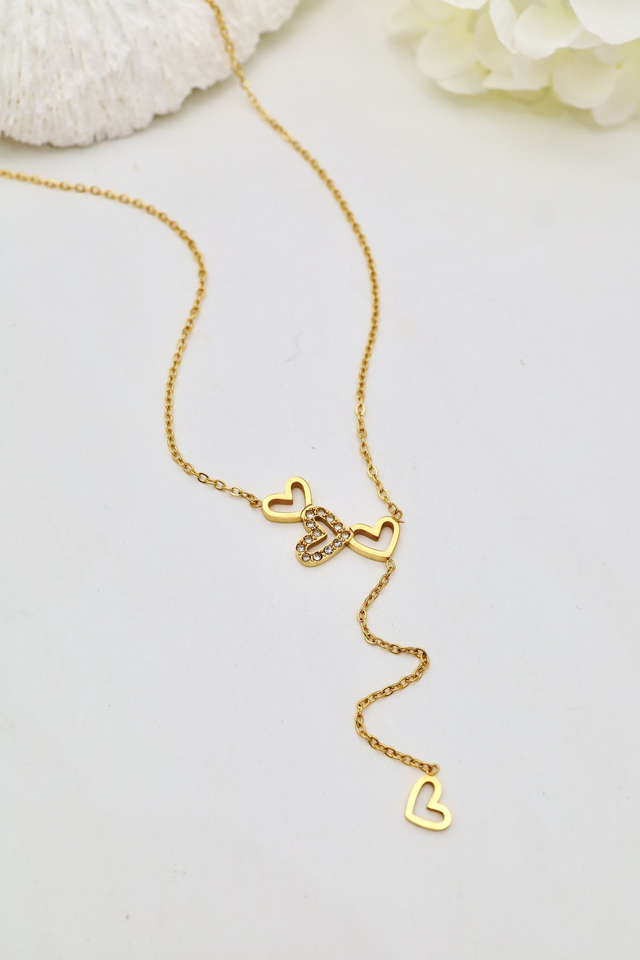 Sa fine chaîne met en valeur un trio de cœurs entrelacés, dont l’un est subtilement orné de strass scintillants, apportant une touche d’éclat raffinée.