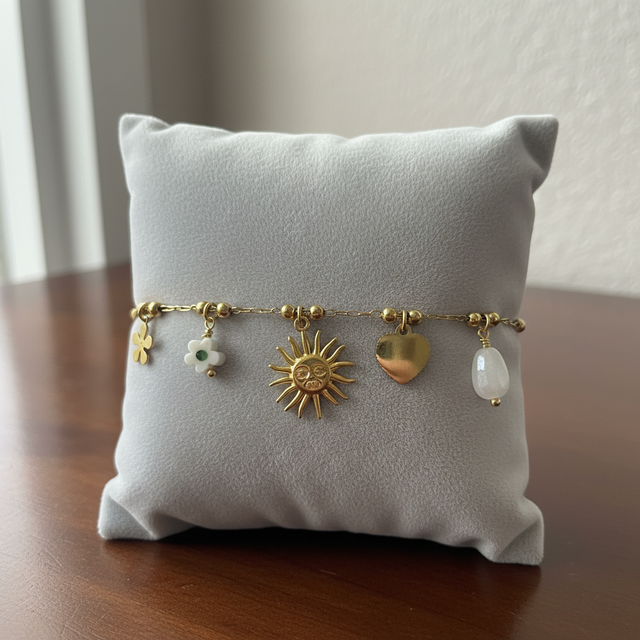 Son pendentif soleil finement détaillé symbolise la chaleur et l’énergie positive, tandis que les petites fleurs délicates ajoutent une note de fraîcheur et de féminité.