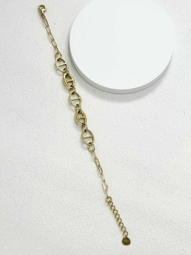 Sublimez votre poignet avec ce bracelet en acier inoxydable doré, conçu avec un design raffiné qui met en avant cinq mailles marines, dont trois sont délicatement torsadées.