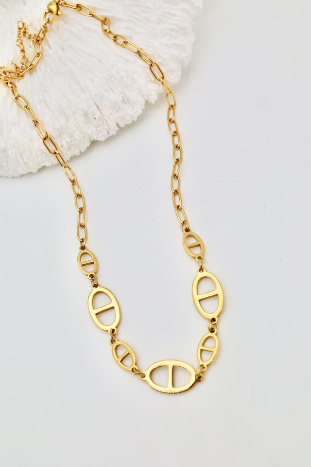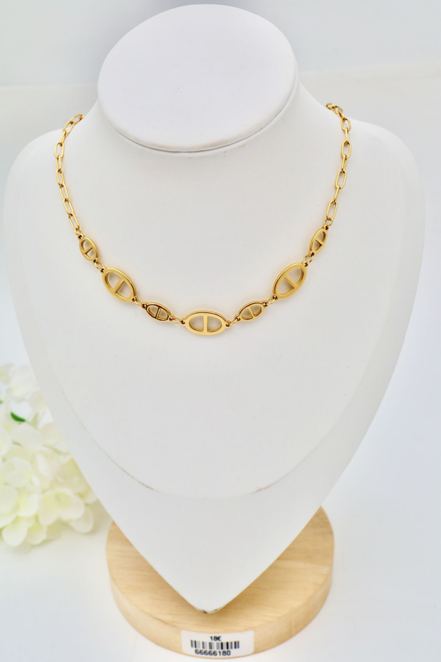 Ajoutez une touche de sophistication à votre look avec ce collier en acier inoxydable doré, présenté avec un design moderne et élégant. Composé de sept maillons stylisés, ce bijou unique attire le regard tout en mettant en valeur votre décolleté avec finesse.